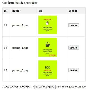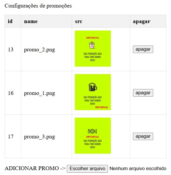 Para adicionar uma promo, basta escolher o arquivo de imagem (jpg, bmo, png) no seu computador ou telefone. Para remover o anuncio basta clicar em "apagar" ao lado do mesmo.