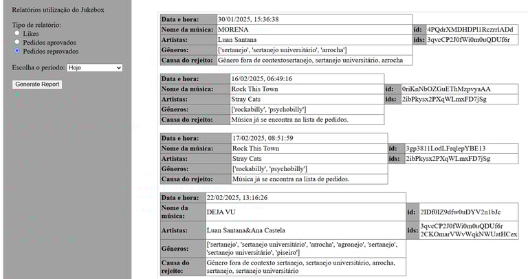 Aqui você pode ver relatórios sobre como seu público interage com o seu evento. Pode-se verificar as canções que receberam mais "likes", a lista das músicas pedidas e aceias pelo seu jukebos e a lista das músicas pedidas mas rejeitadas, podendo também verificar a razão (o gênero) que causou a aceitação ou a rejeição.