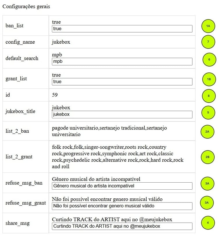 3B - refuse_msg_grant: Aqui você pode escolhe a mensagem que será exibida ao se rejeitar uma música por que nenhum dos gêneros do artista se encontra na lista list_2_grant.